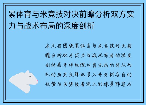 累体育与米竞技对决前瞻分析双方实力与战术布局的深度剖析